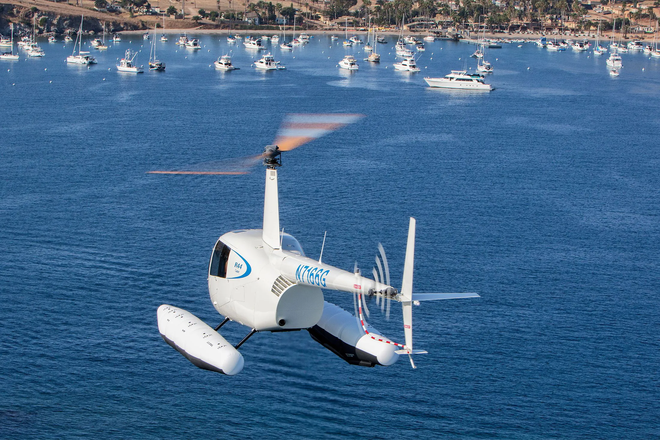 The R44 FLOAT CADET is equipped with fixed utility floats providing an extra layer of safety for over-water operations. Fixed utility floats remain fully inflated, add approximately 50 pounds to the aircraft’s empty weight, and reduce cruise speed by approximately ten knots.